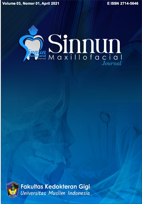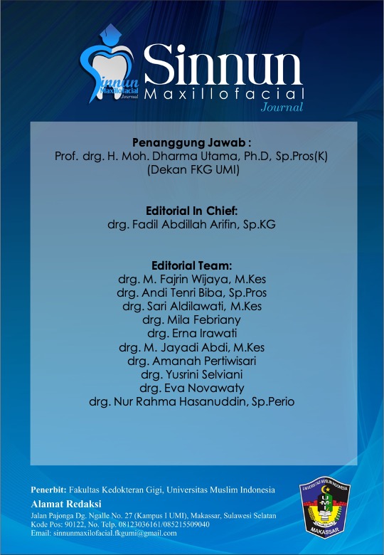 Sinnun Maxillofacial Journal is a publication of scientific work in the field ofdentistry in a broad sense such as peridodontic, pedodontic, conservative dentistry, endodontic, dental material, oral biology, oral and maxillofacial surgery, prosthodontic, orthodontic, dental radiolgy, dental medicine and community dentistry. In addition, the Journal was first established since 2019 by the Institute of Study and Management Center Journal of the Faculty of Dentistry Universitas Muslim Indonesia located in Makassar, South Sulawesi. Sinnun Maxillofacial Journal published on April and October with E-ISSN 2714-5646. This journal has also collaborated with Persatuan Dokter Gigi Indonesia (PDGI) in terms of assisting the advancement of dental health and disseminating research results.