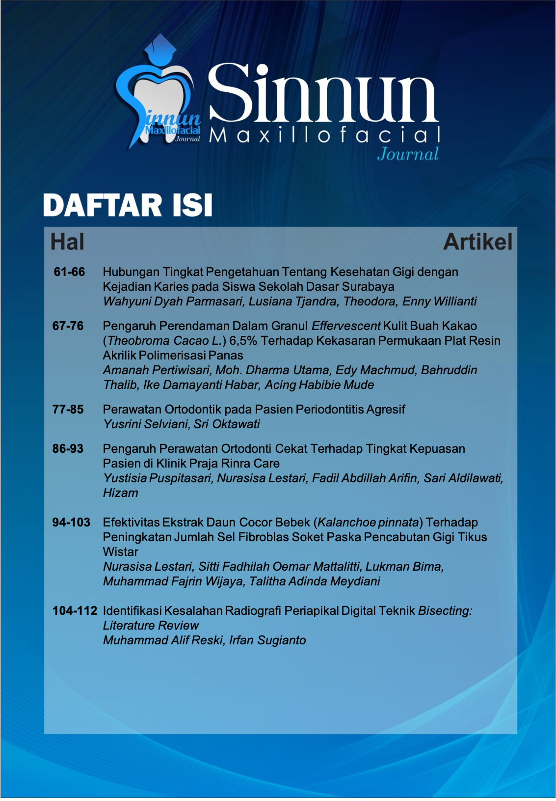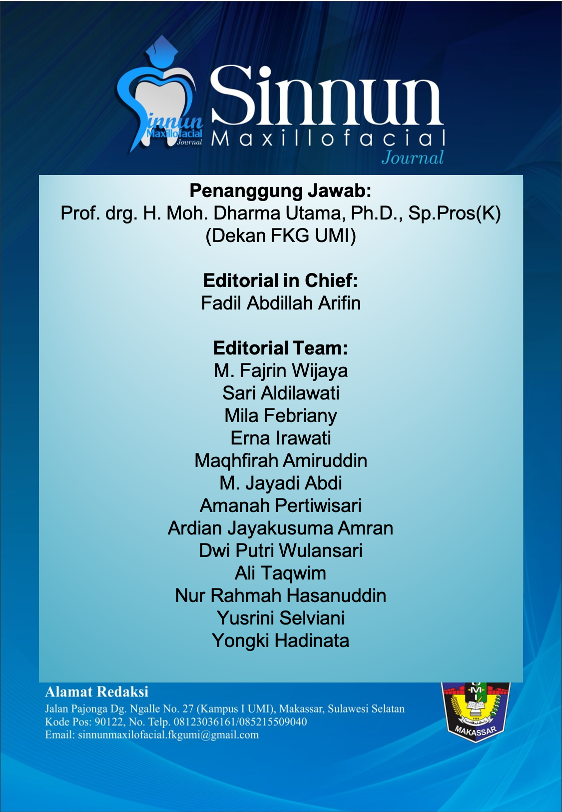 Sinnun Maxillofacial Journal is a publication of scientific work in the field ofdentistry in a broad sense such as peridodontic, pedodontic, conservative dentistry, endodontic, dental material, oral biology, oral and maxillofacial surgery, prosthodontic, orthodontic, dental radiolgy, dental medicine and community dentistry. In addition, the Journal was first established since 2019 by the Institute of Study and Management Center Journal of the Faculty of Dentistry Universitas Muslim Indonesia located in Makassar, South Sulawesi. Sinnun Maxillofacial Journal published on April and October with E-ISSN 2714-5646. This journal has also collaborated with Persatuan Dokter Gigi Indonesia (PDGI) in terms of assisting the advancement of dental health and disseminating research results.